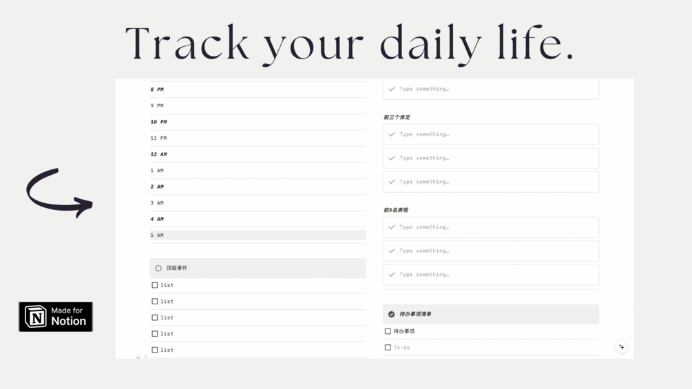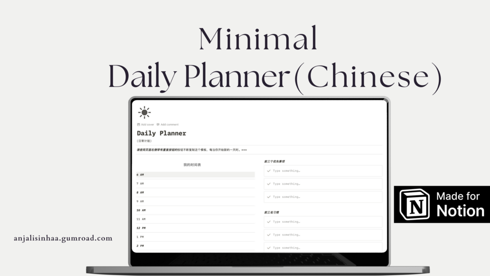 使用我们的每日计划表,您可以在直观的Notion平台内无缝地计划、优先排序和跟踪您的任务、约会和目标。 无论您是忙碌的专业人士,还是兼顾多重责任的学生,还是仅仅努力改善时间管理的人,这个模板都是您掌握日常承诺的首选解决方案。