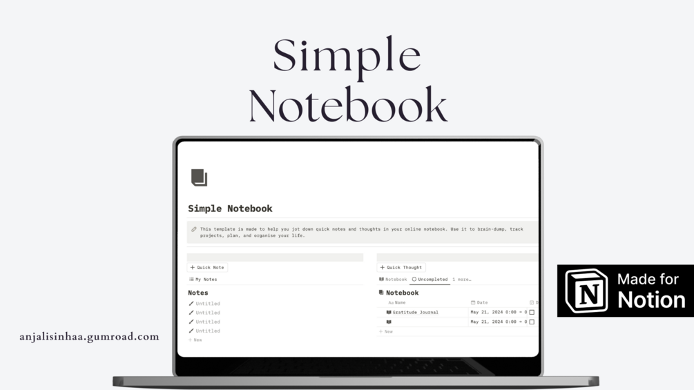 Keeping your thoughts organized shouldn't be a hassle. Our Simple Notebook Notion template streamlines your note-taking process, making it effortless to manage your ideas, tasks, and plans all in one place.